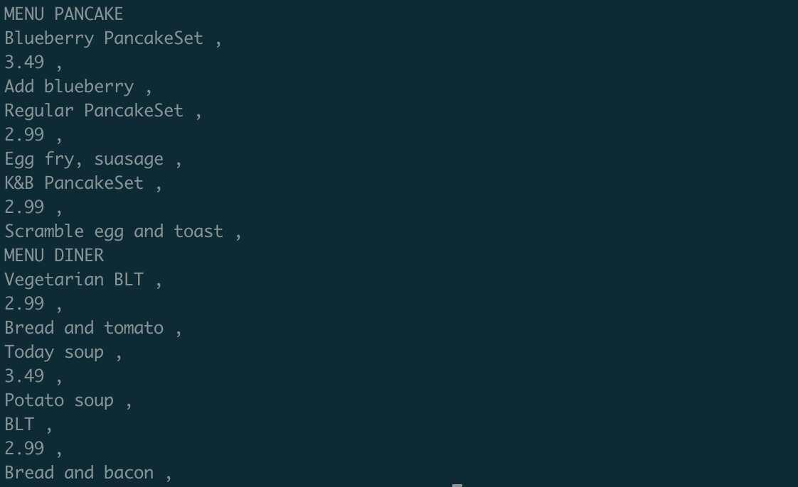 self.addMenu('Vegetarian BLT', 'Bread and tomato', True, 2.99)
