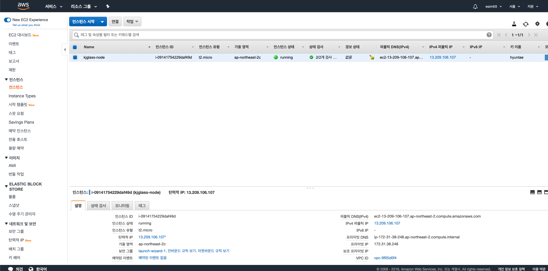 9. 콘솔에 인스턴스 -> 인스턴스 에 들어가면 이렇게 새로운 인스턴스가 생성된 것을 보실 수 있습니다.