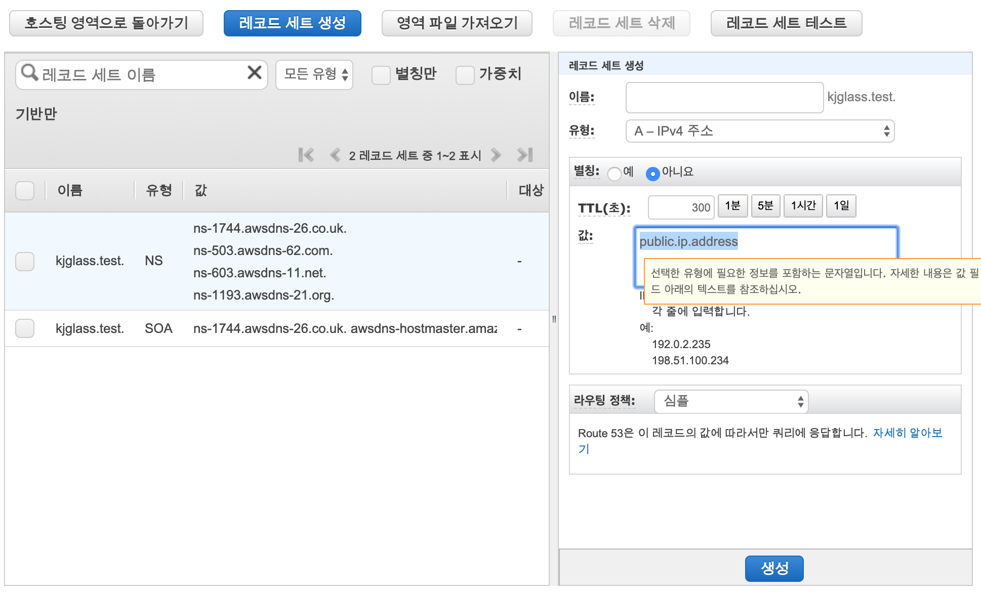 [레코드 세트 생성] 버튼을 눌러서 저기 값 부분에다가 저의 인스턴스 ip주소를 적어주면 됩니다.