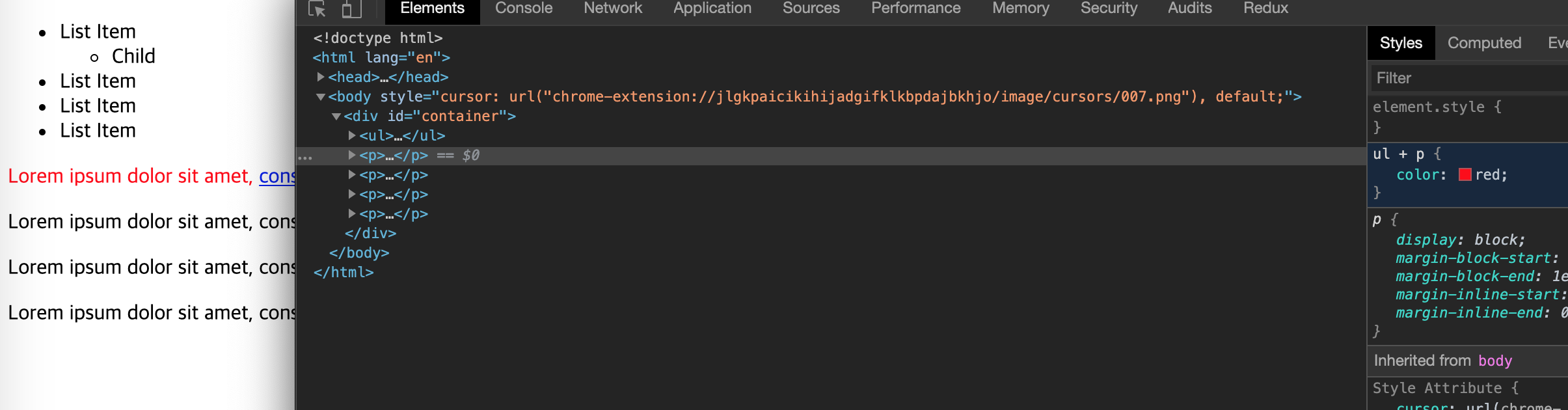 'List Item 1' 가 p 태그로 감싸져 있는데 1 번인 경우 div 에 자식안에 있는 모든 p의 적용 되기 때문에 ul 태그 안에 있어도 스타일이 적용 되는 반면 2 번인 경우 'List Item 1' 이 div 의 직계 자손이 아니기 때문에 스타일이 적용 되지 않는 것을 볼 수 있습니다.