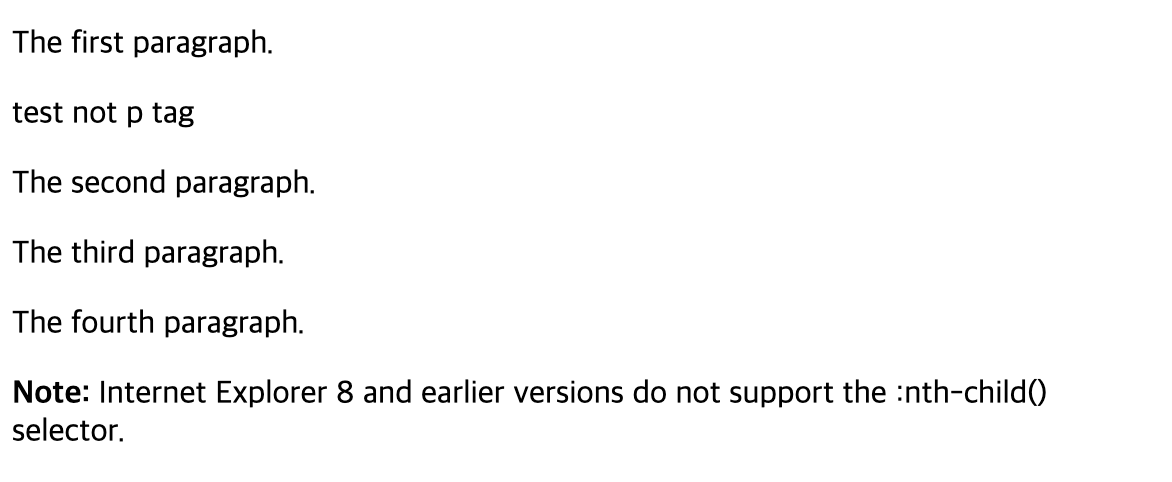 <p><b>Note:</b> Internet Explorer 8 and earlier versions do not support the :nth-child() selector.</p>