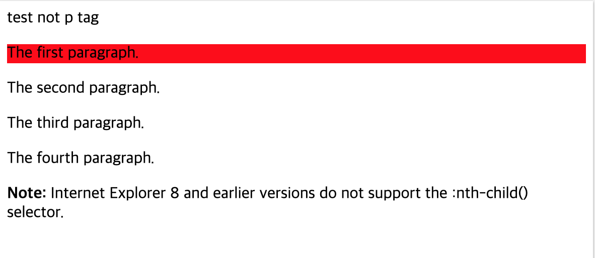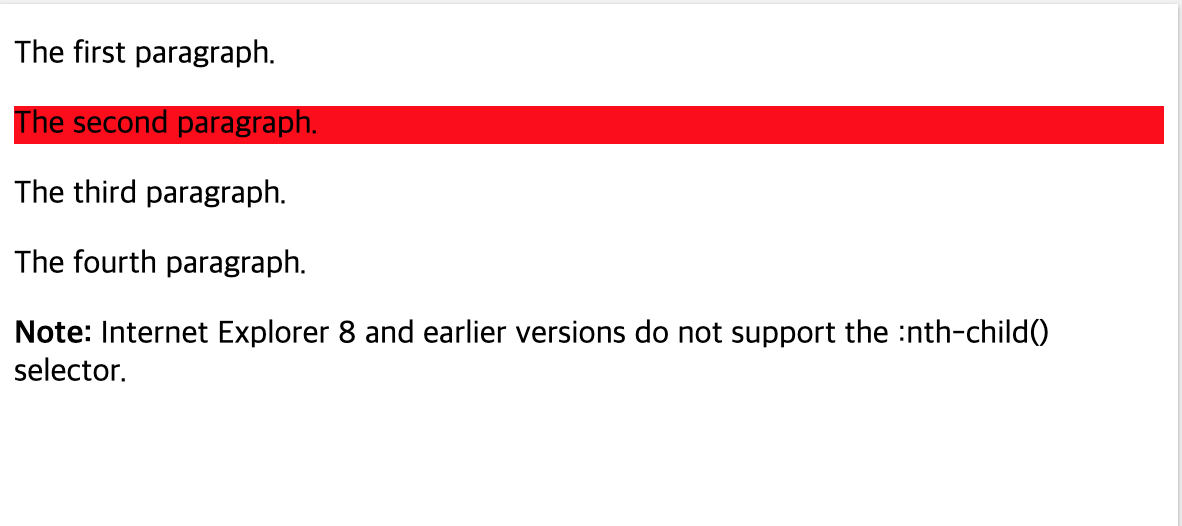 p 태그인 2번째 자식 요소의 스타일을 적용하자 그렇다면 'The first paragraph.' 의 스타일이 적용 되겠죠? 왜냐하면 그것이 두번째 자식 요소이고 p 태그이기 때문이죠.